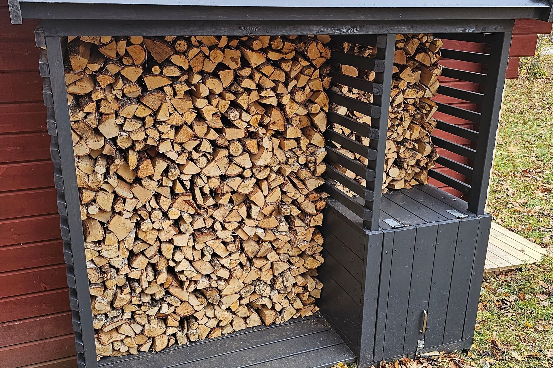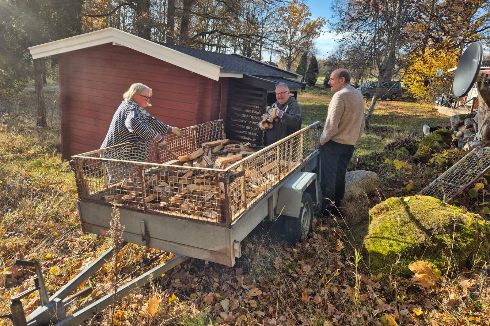 Größte Neuerung diesmal: der Holzstand an der Rückseite der Gartenhütte wird endlich befüllt! Ulrika & Henrik haben eine Fuhre Feuerholz zum Schnapperpreis besorgt. Und bringen sie per Leihanhänger vorbei. Die Hauseigentümer laden aus und packen die Scheite (unter prüfendem Blick vom deutschen Nachbarn Konrad, welcher ebenfalls die Ferienhaussaison beschließt) in den Stand. Menge und Größe der Holzstücke passen wunderbar. Nochmal einen Dank an Schreiner sowie Nachbar Martin fürs Errichten des Holzstandes!