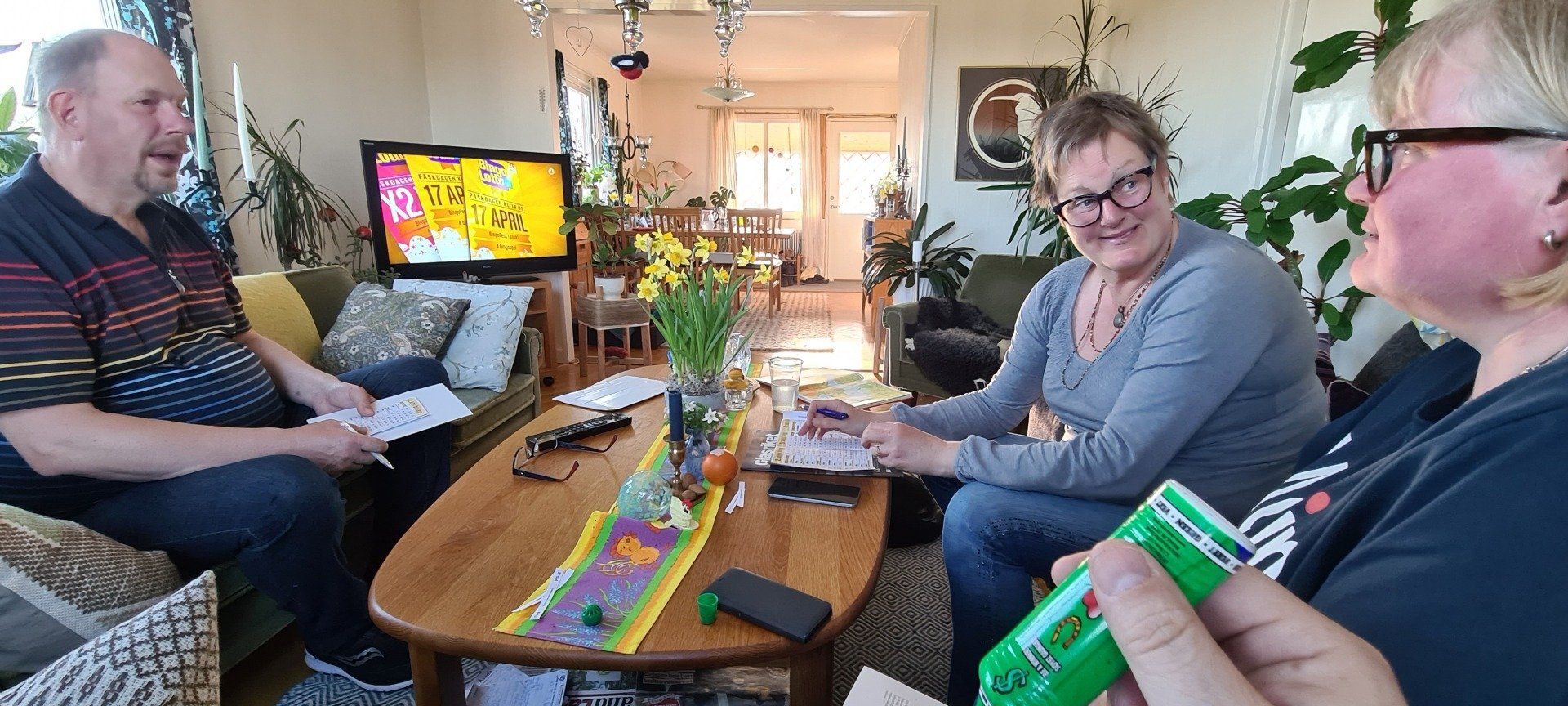 Wir haben eine neue Markise! Per Knopfdruck spendet sie Schatten auf der Terrasse und sieht schick aus. Auch der Osterhase freut sich und lässt was da. Ulrika & Henrik schenken uns die passende Dekoration, in Form von selbstgefertigten Birkenosterhühnern. Außerdem laden sie zum Bingoabend ein. Wir erfreuen uns an schwedischer Gastfreundschaft und lokalem TV-Programm. Einen reimportierten Volkswagen geben unsere Tippscheine nicht her.