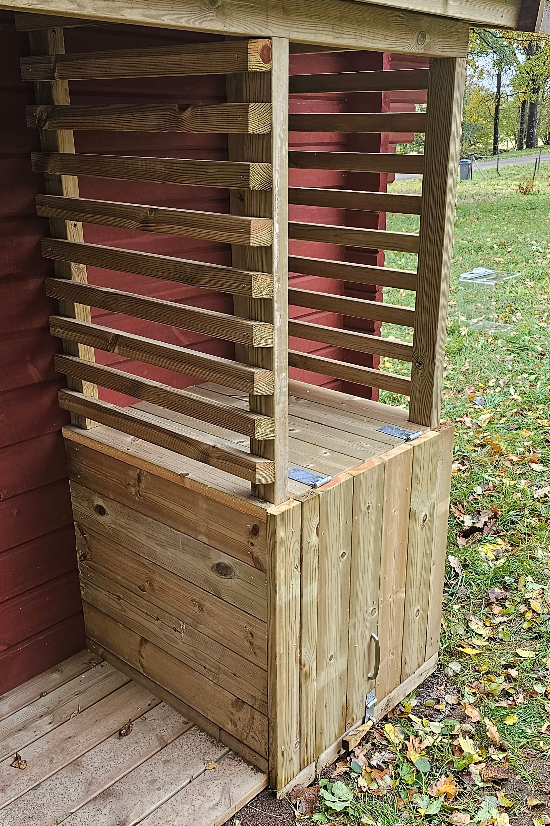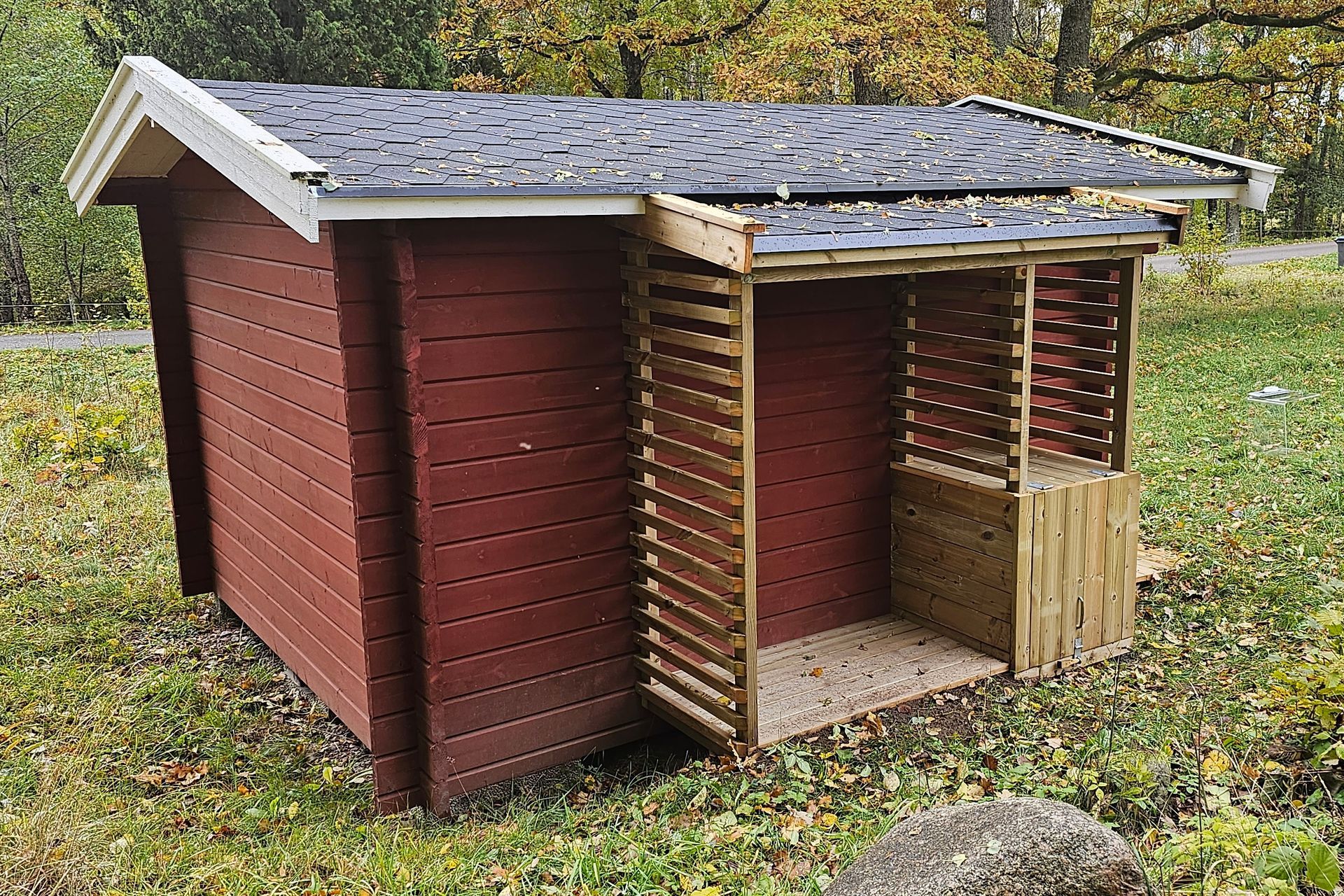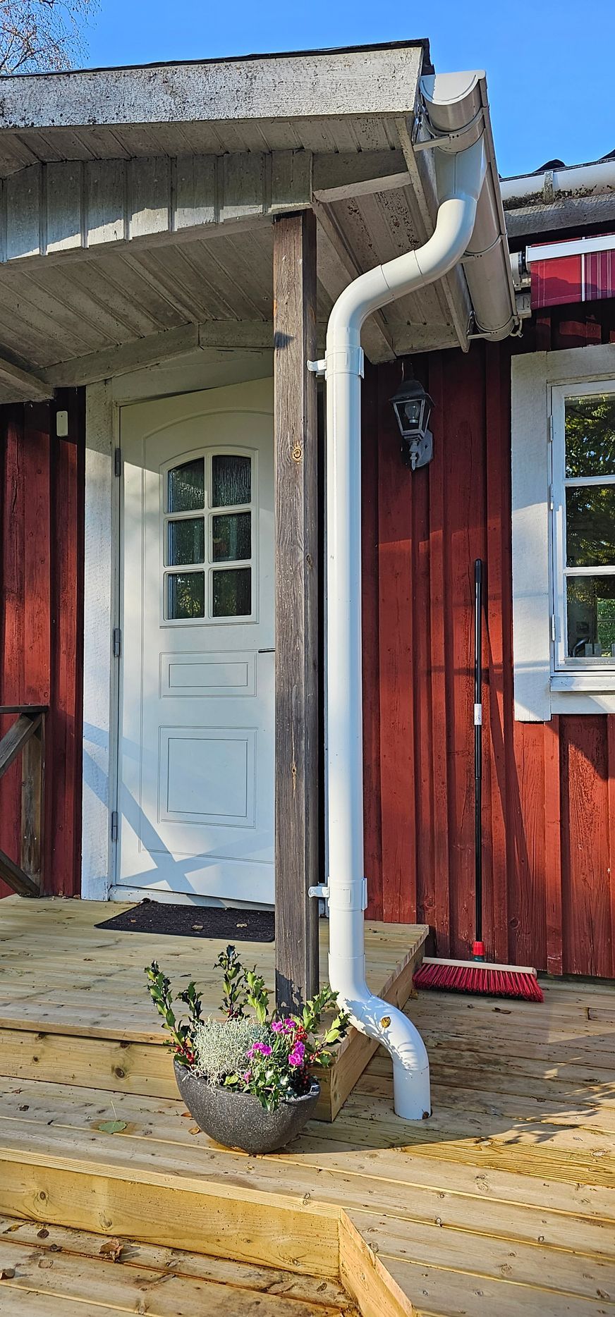 Erfreut sind wir über die Ergebnisse der Terrassensanierung. Tischler und Nachbar Martin hat hervorragende Arbeit geleistet. Die Terrasse zeigt sich wieder vorzeig- und belastbar. Eine Regenrinne fängt nun vom Vordach laufendes Regenwasser auf. Ohne wurden zuvor die Bodenbretter stark beansprucht und moderten. Beim Schuppen gibt es jetzt einen Unterstand zum Lagern von Feuerholz, für den schicken neuen Terrassenofen. Außerdem hat Martin den Bodenspalt vor der Eingangstür mit einer kleinen Rampe überbrückt. Nun lassen sich Sachen ohne Stolpergefahr rein- und raustragen.