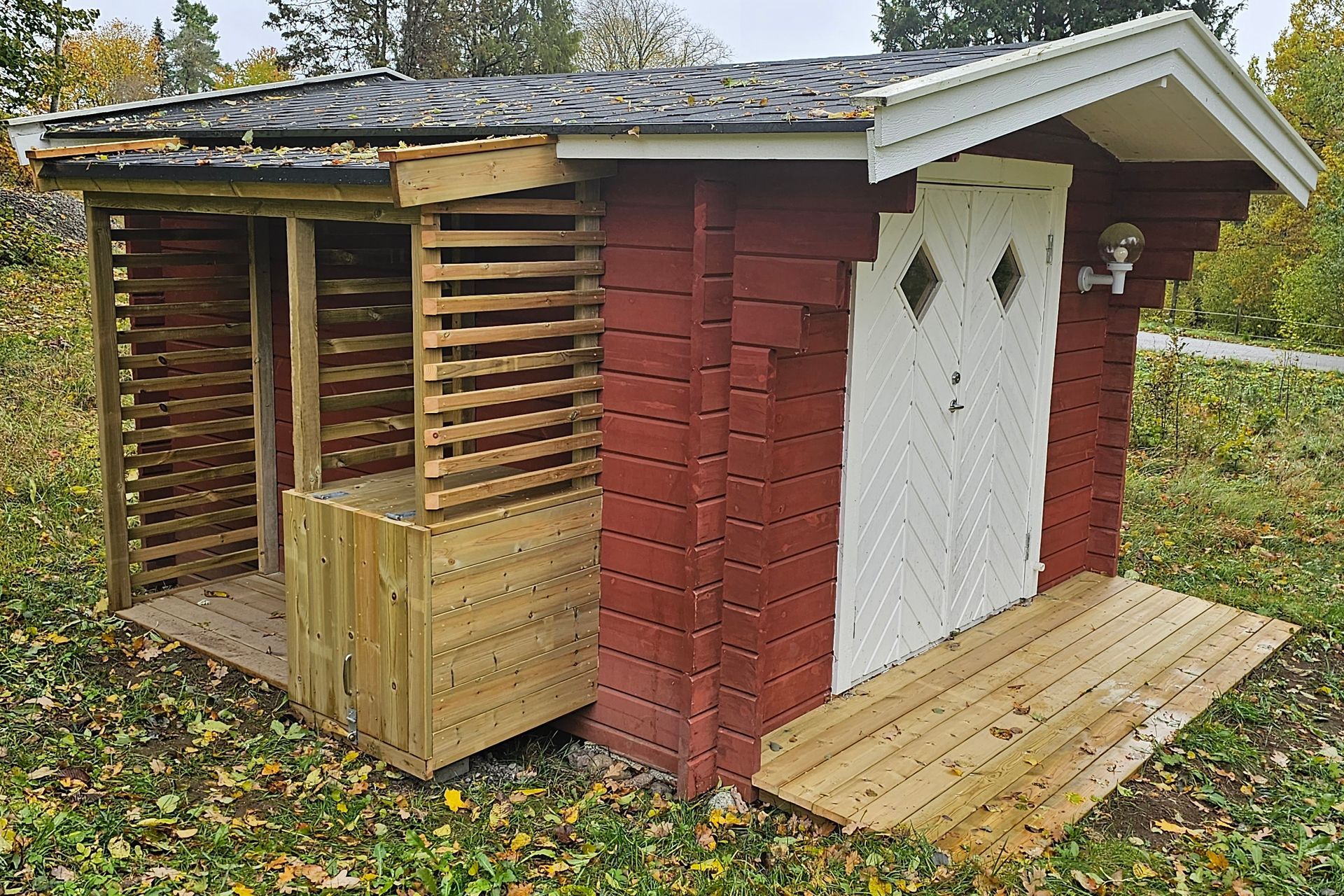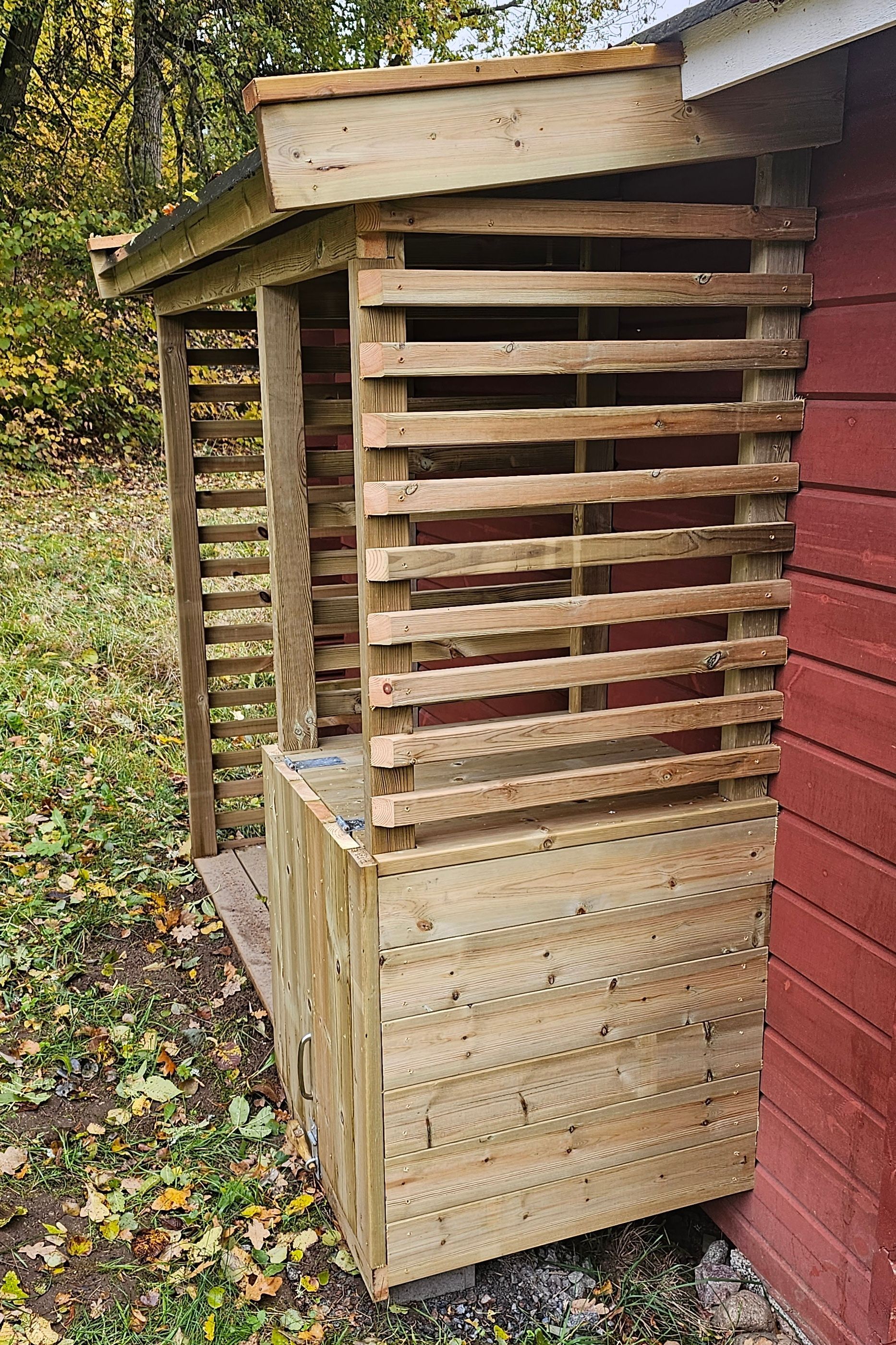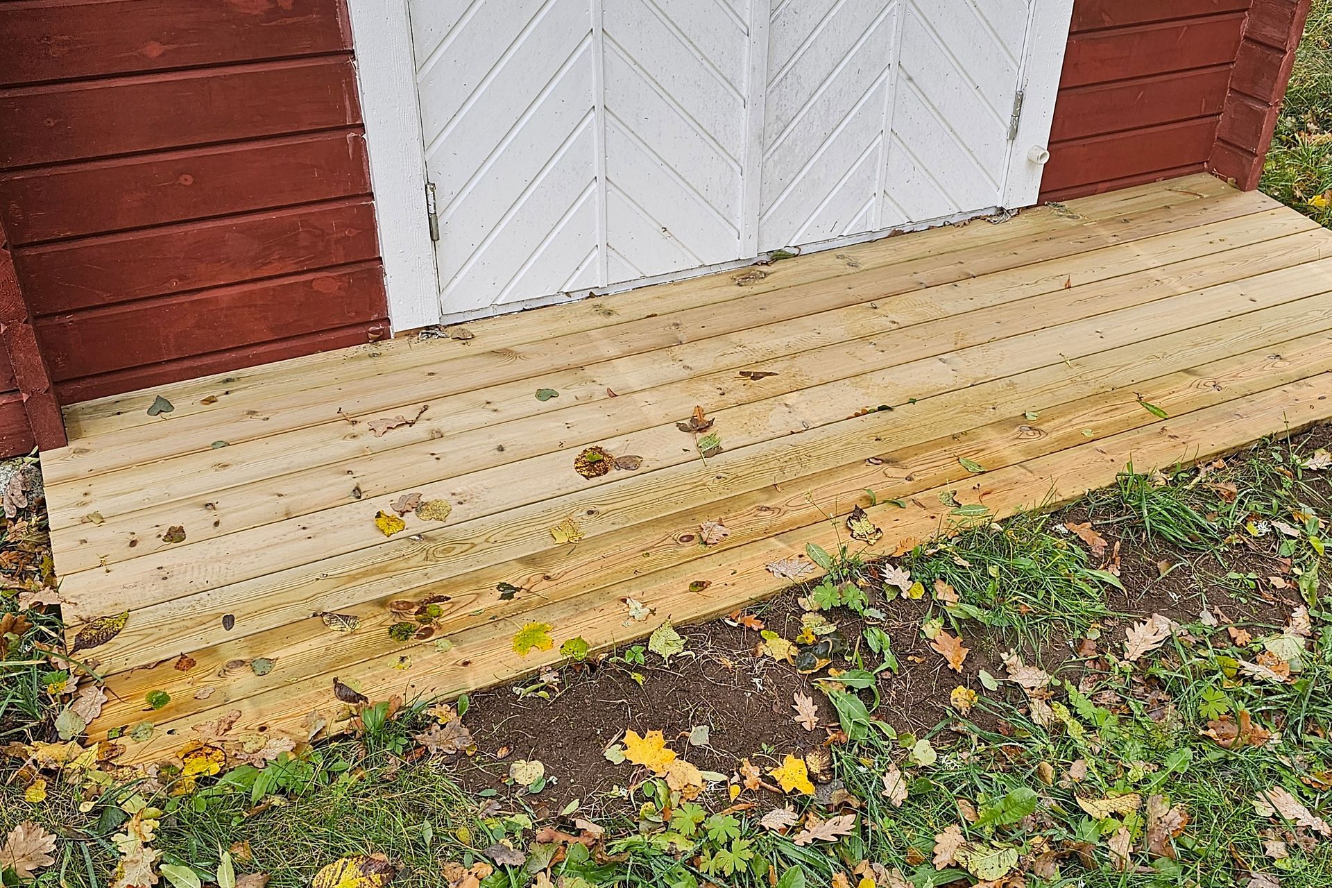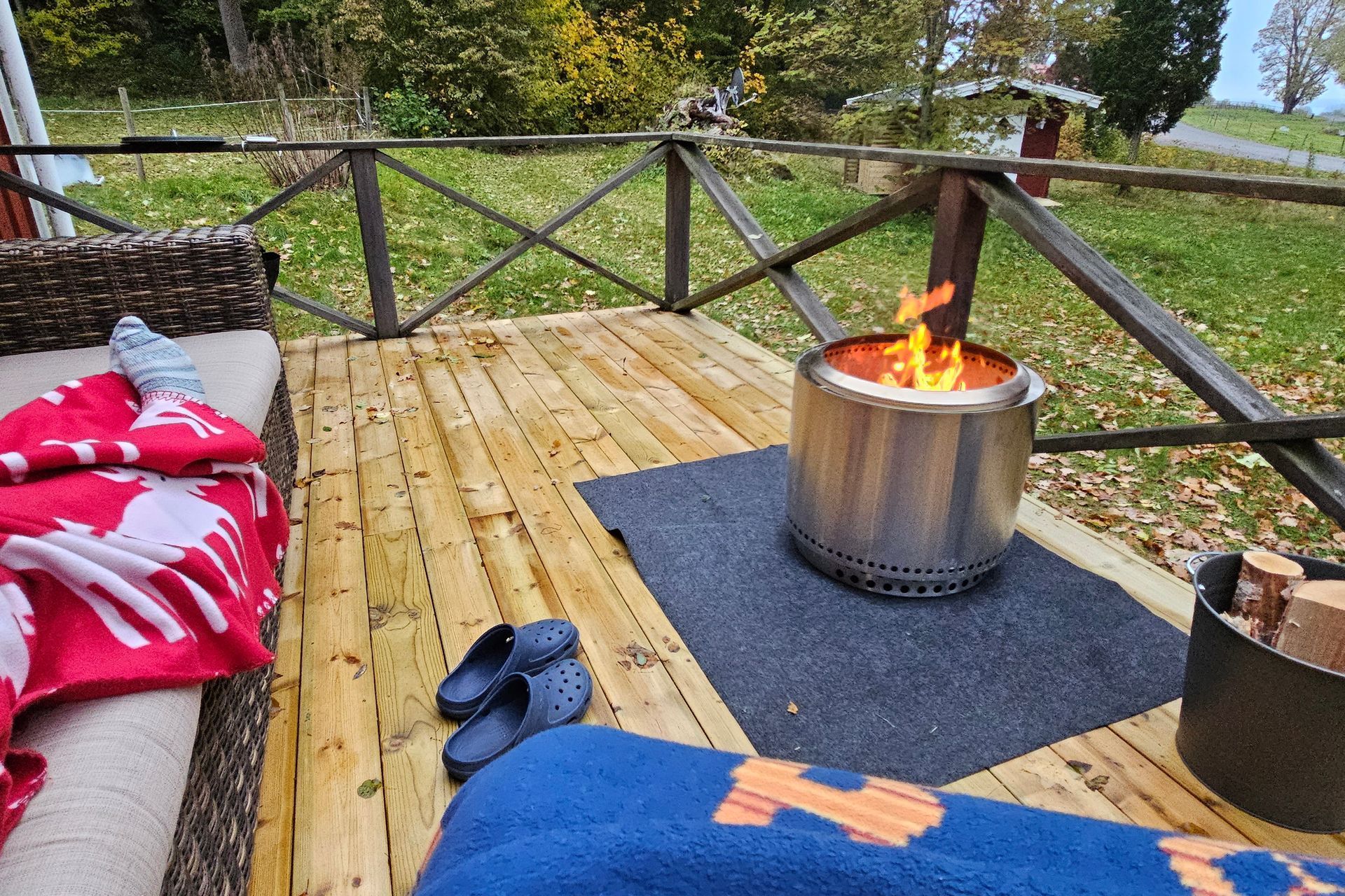 Erfreut sind wir über die Ergebnisse der Terrassensanierung. Tischler und Nachbar Martin hat hervorragende Arbeit geleistet. Die Terrasse zeigt sich wieder vorzeig- und belastbar. Eine Regenrinne fängt nun vom Vordach laufendes Regenwasser auf. Ohne wurden zuvor die Bodenbretter stark beansprucht und moderten. Beim Schuppen gibt es jetzt einen Unterstand zum Lagern von Feuerholz, für den schicken neuen Terrassenofen. Außerdem hat Martin den Bodenspalt vor der Eingangstür mit einer kleinen Rampe überbrückt. Nun lassen sich Sachen ohne Stolpergefahr rein- und raustragen.