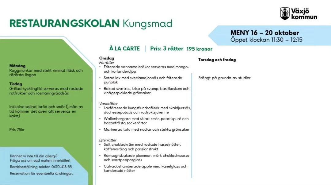Unsere beiden Nachbarn zeigen uns einen neuen Restauranttipp. In der Kungsmadskolan in Växjö werden Gastrokräfte ausgebildet. Zur Berufsschule gehört ein Übungsrestaurant, in professionell sowie geschmackvoll gestalteten Räumlichkeiten. An mehreren Tagen pro Woche wird ein mehrgängiges Menü zum kleinen Preis serviert. Wir zahlen für drei hervorragende Gänge keine 18 Euro - vielleicht ein Drittel von üblichen Restauranttarifen. Tischreservierung ist erforderlich.