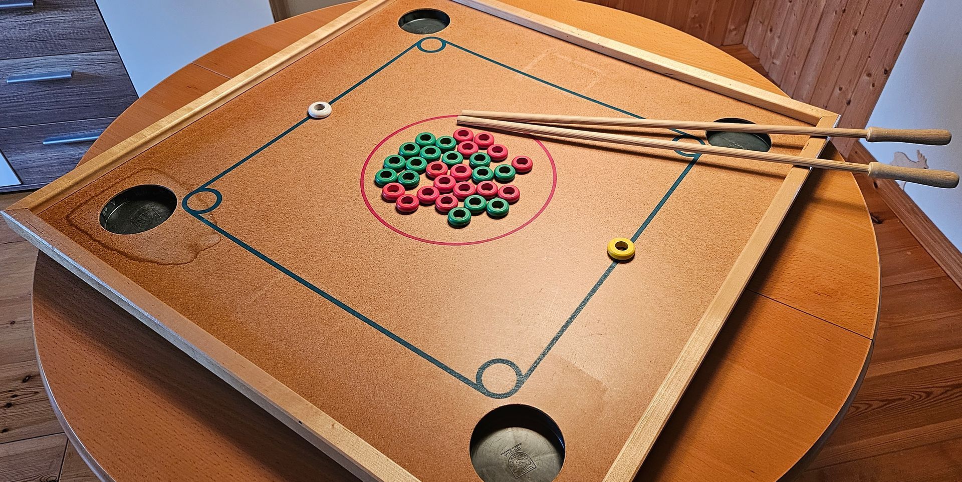 Wir genießen unsere Zeit mit den üblichen Schwedenfreuden. Bei Erikshjälpen finden wir den kleinen Bruder von Carrom. Couronne ist ebenfalls ein Holzbrett mit Löchern in den Ecken. Spielsteine werden darin mit Mini-Queues versenkt. Sodass das Spiel mehr von Billard hat. Wir spielen eine Partie mit Ulrika und Henrik. Zuvor gibt es die traditionelle Linsensuppe à la Ulla.