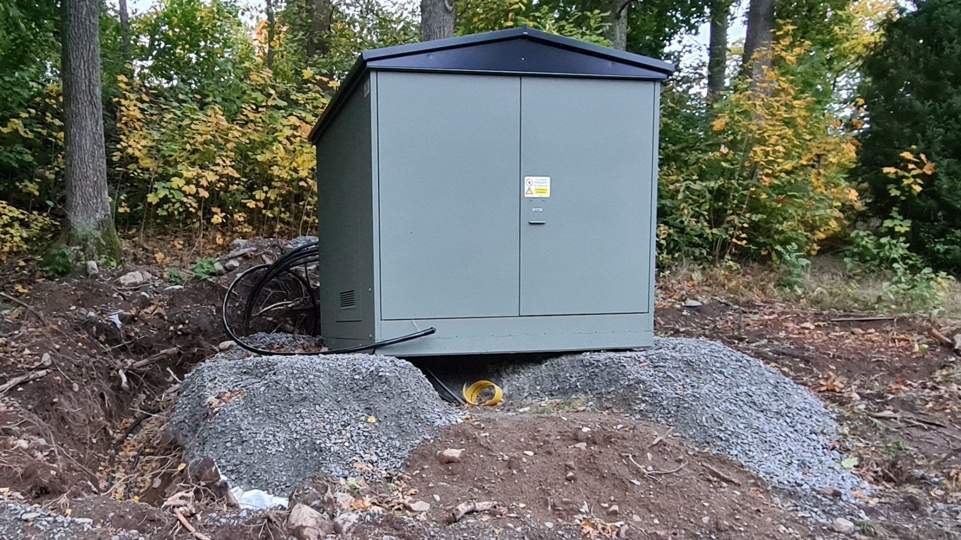 Die Verlegung unterirdischer Stromkabel schreitet voran. Der Bezirk Vetlanda hat ein Transformatorenhäuschen in unmittelbarer Nähe zu unserem Grundstück aufgestellt. Hinter unserer Gartenhütte, sodass der Panoramablick nicht (wie zunächst befürchtet) beeinträchtigt wird. Im Zuge der Arbeiten gibt es zwei Stromausfälle, vorab per Brief angekündigt. Wir überbrücken sie mit Aktivitäten außer Haus.