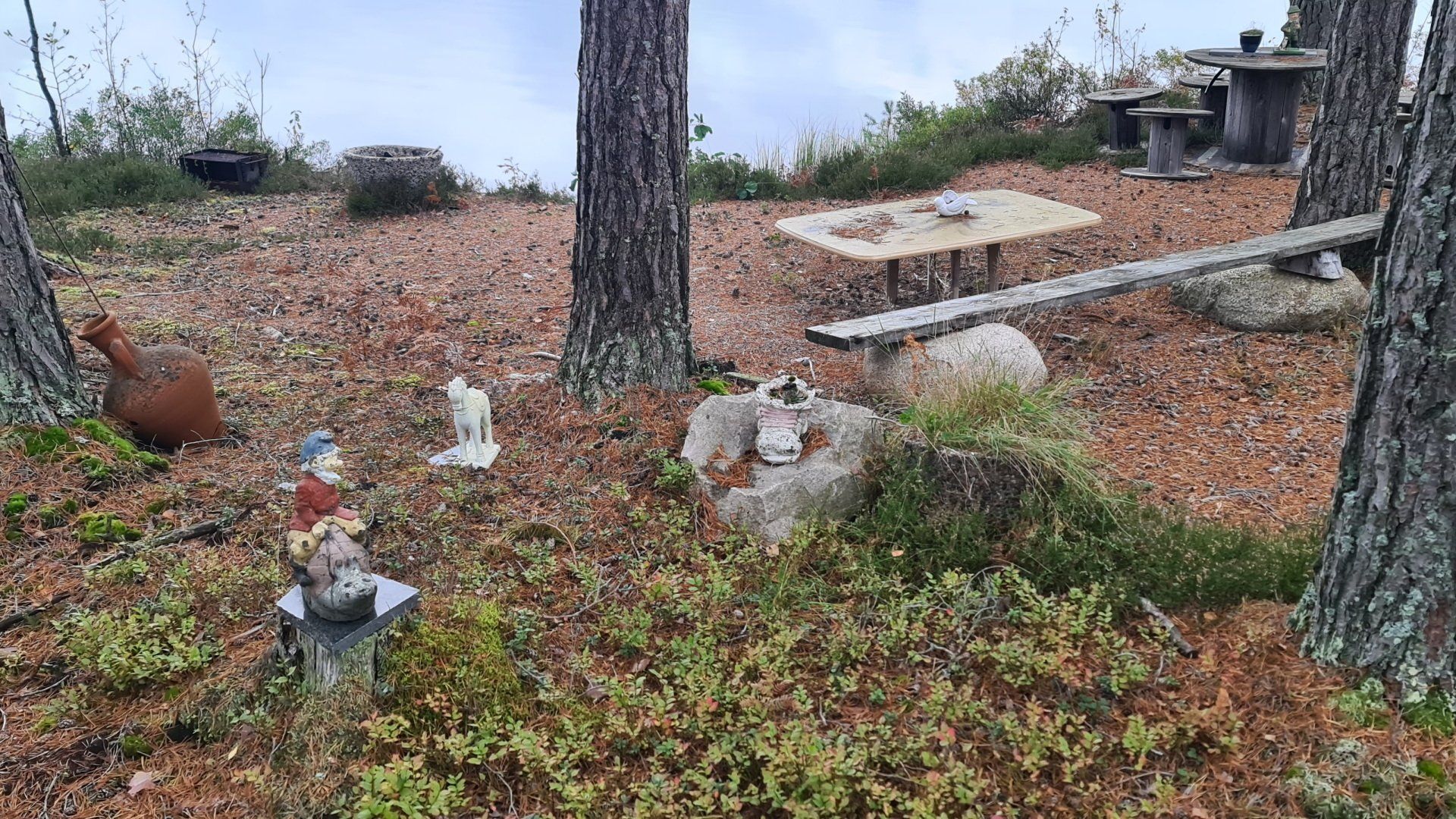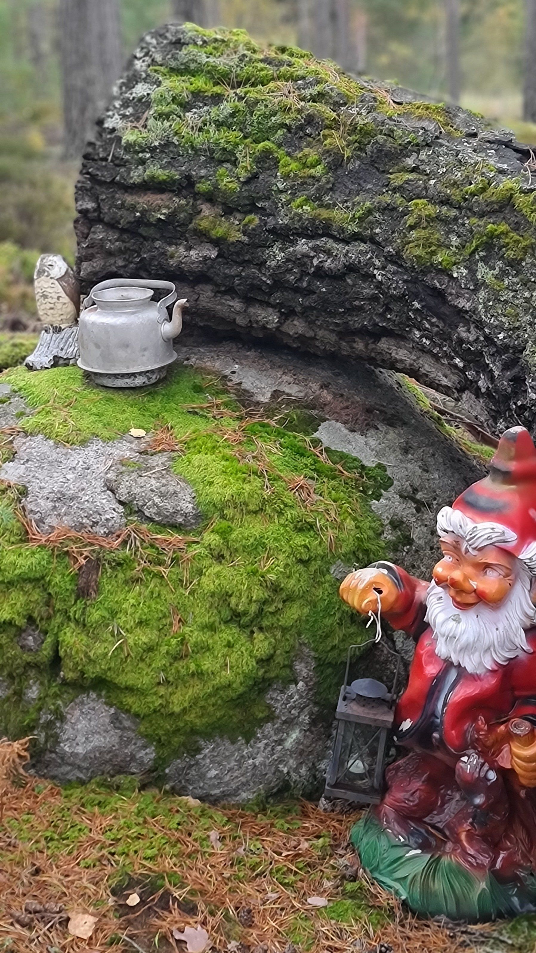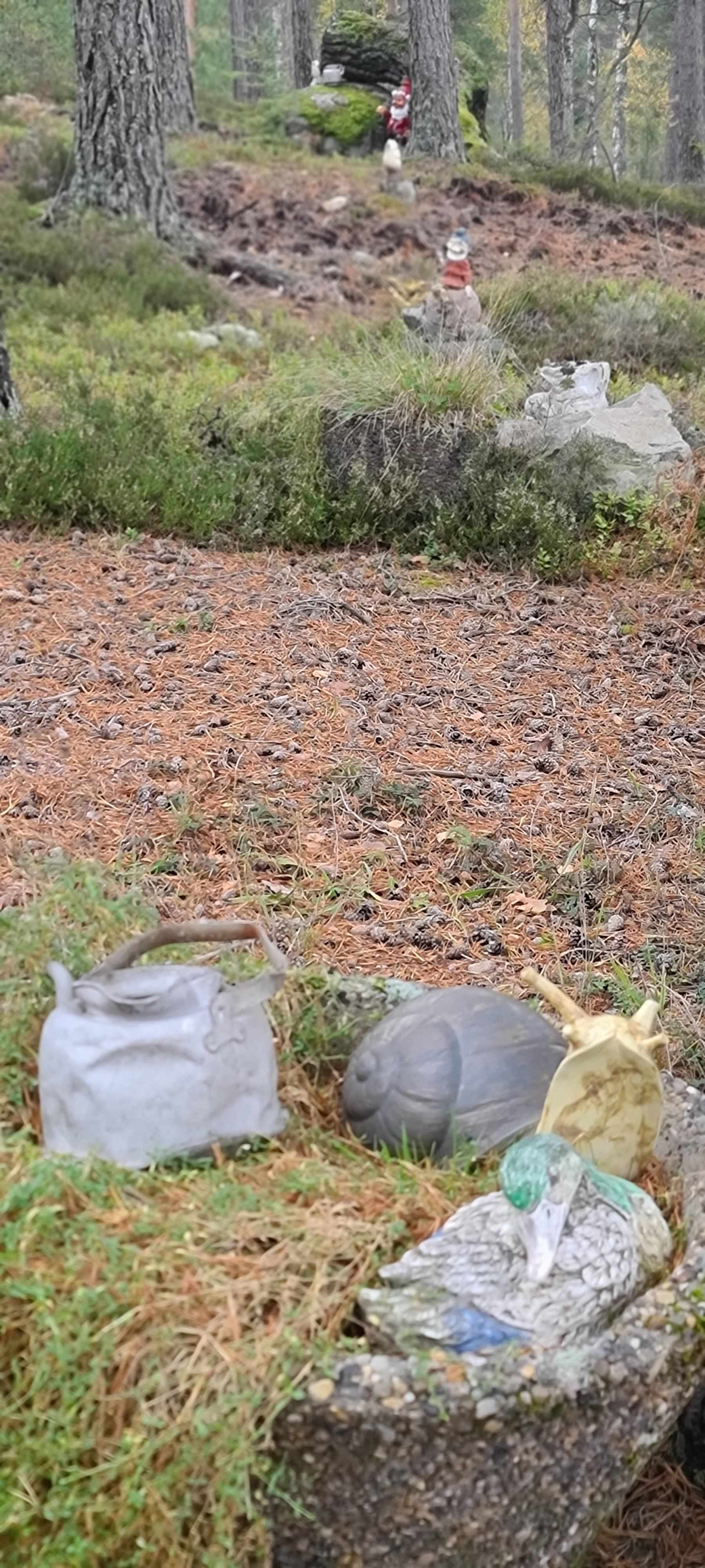Eine Entdeckung ganz anderer Art ergibt sich in Skärbäck: die Troll-Kultstätte am Lillesjön. An der Blockhütte mit traumhafter Seelage links weitergehend. Wie Gartenzwerge, Feen, Engel und andere Figuren dort hinkamen und pittoresk im Wald drappiert wurden, erfahren wir nicht. Spooky - aber stimmungsvoll. Mal schauen, wie es dort im nächsten Jahr aussehen wird.